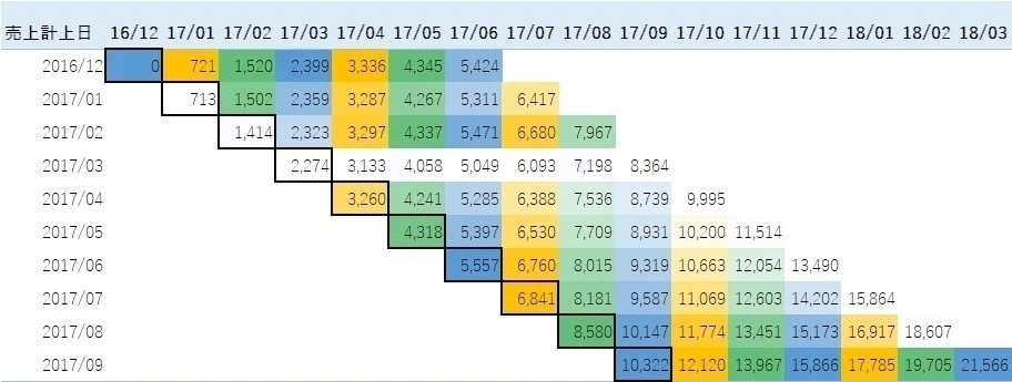 Beyond Accounting の予算管理は、予算期間を自由に取れます。例えば、次のように、目標を一つ固定で持って, 予測 (フォーキャスト) は, 順に期間をずらしていきます。