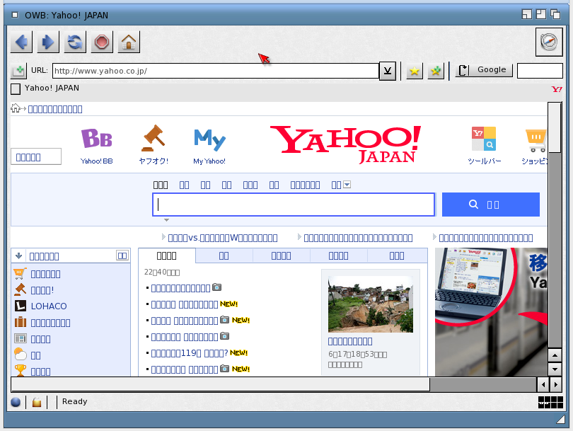 Yahoo! Japanを表示させてみた。日本語はまだ対応していないのか, 設定の問題なのかは追いきれていないが, とにかく初期設定のままでは文字化けした。