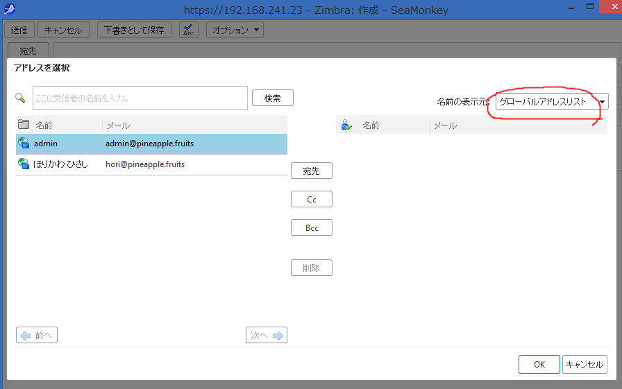 Zimbra の Webメールクライアントには「連絡先」タブがある。しかし、これは個人アドレス帳で, 共有できないみたい。