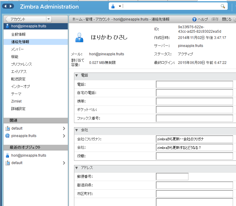 Zimbra Administration のホーム画面から、管理 > アカウント > 各アカウント, で、内容を表示する。
