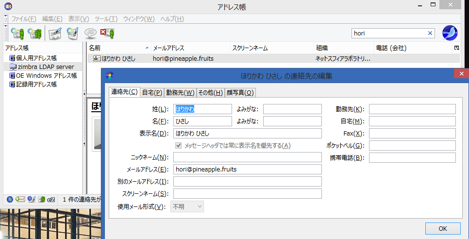 Zimbra では,「会社」は 'company' という LDAPアトリビュートに格納するが、SeaMonkey では 'o' というアトリビュートを期待している。